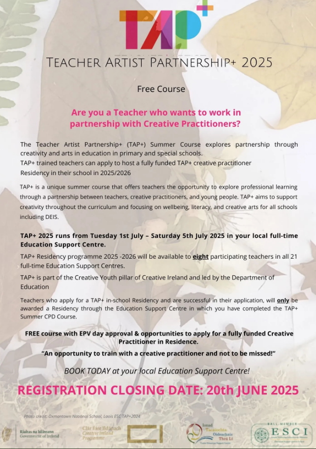 During the summer course teachers will have the opportunity to apply for a TAP+ Residency to take place in partnership with a creative practitioner from their summer course and their students in the school year 2025/2026. Each Education Support Centre will have 8 Residencies for participating teachers on the TAP+ Summer Course.
